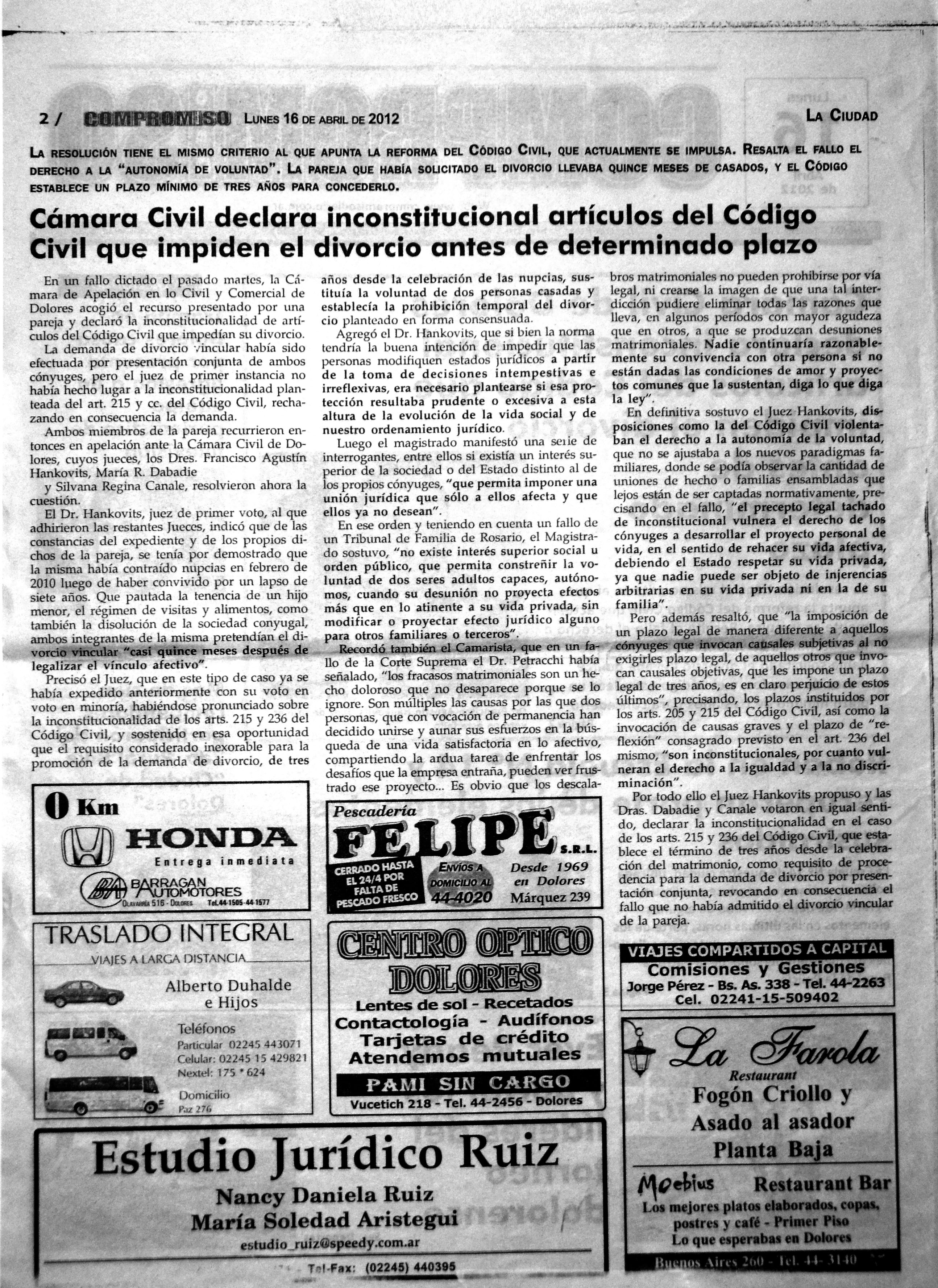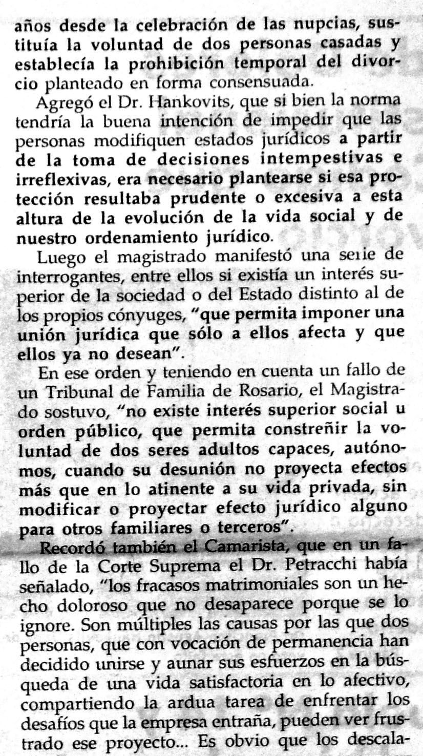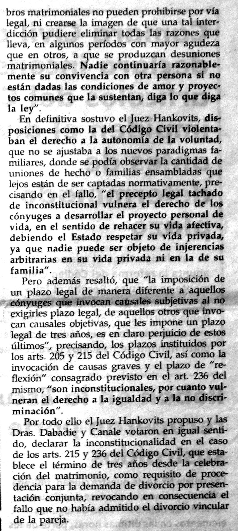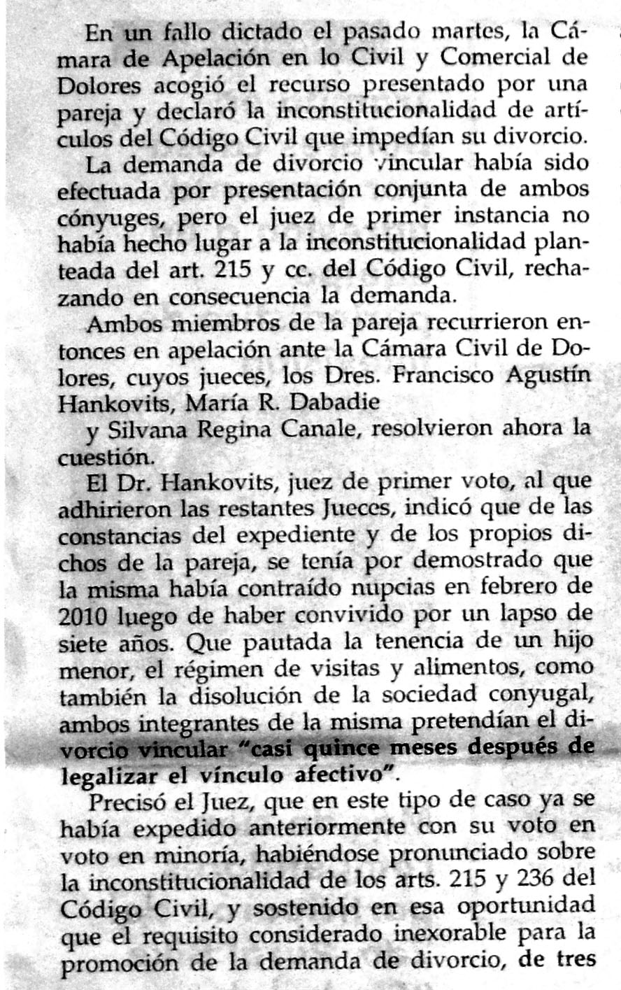 El estudio logró un fallo sin precedentes a esa fecha, declarando la excelentísima cámara departamental civil la inconstitucionalidad de artículos del código civil (anterior al vigente) que imposibilitaba el divorcio por presentación conjunta antes de los tres años de casado. Este fallo fue utilizado en toda la provincia como precedente hasta el dictado actual Código civil y comercial.